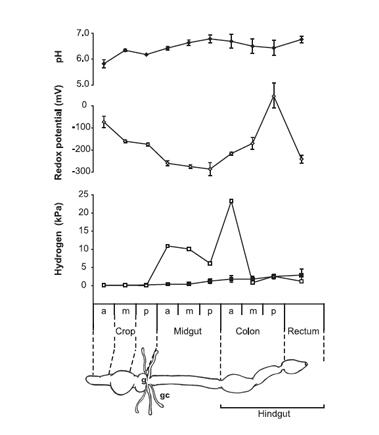 根據(jù)微電極數(shù)據(jù),Schauer等人(2012年)得出結(jié)論,Shelfordellalateralis的腸道在所有腸道隔間的中央都有一個(gè)缺氧和還原性環(huán)境,pH從近端到遠(yuǎn)端隔間都略有增加。此外,研究人員還發(fā)現(xiàn)在整個(gè)腸道中發(fā)現(xiàn)了低濃度的氫氣,中腸和后腸中的氫氣的積累很可觀。