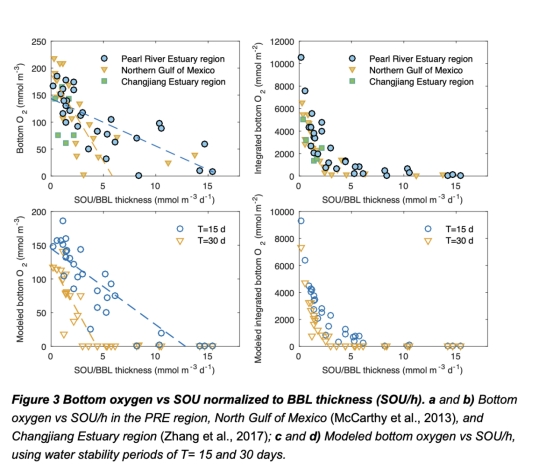 (3)質(zhì)量平衡模型成功量化缺氧形成時(shí)間(圖4b-c),并解釋跨系統(tǒng)差異(如墨西哥灣缺氧時(shí)間更長(zhǎng))。