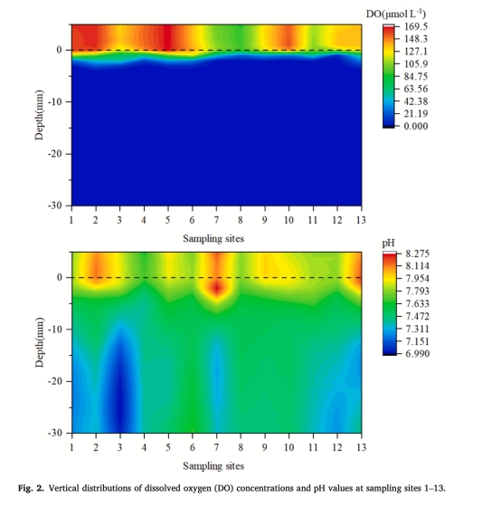 結(jié)合微電極(丹麥Unisense)原位測(cè)定沉積物pH和溶解氧(DO)(圖2),分析氧化還原條件。