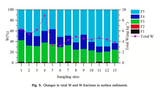 通過連續(xù)提取法分析沉積物中鎢的化學(xué)形態(tài)(圖5、表1)。