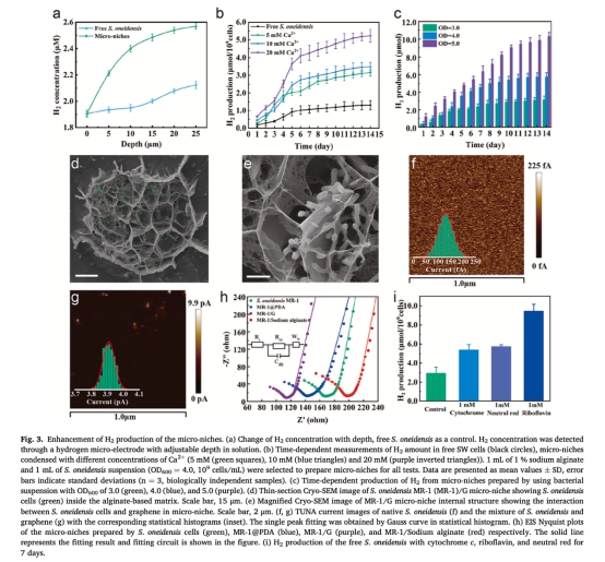 通過Unisense微電極測得的氧氣濃度數(shù)據(jù)(圖2h)顯示,微生態(tài)位內部深度25μm處氧氣濃度趨近于零,表明呼吸代謝成功創(chuàng)造了缺氧環(huán)境。這一數(shù)據(jù)直接驗證了微環(huán)境設計的核心機制——缺氧是氫酶催化產(chǎn)氫的必要條件。此外,氧化還原電位隨深度降低(圖2i)進一步表明微環(huán)境內部形成了強還原性微區(qū),為產(chǎn)氫反應提供了熱力學驅動力。這些數(shù)據(jù)不僅證實了理論假設,還為優(yōu)化微環(huán)境結構(如細胞密度、材料導電性)提供了實驗依據(jù)。
