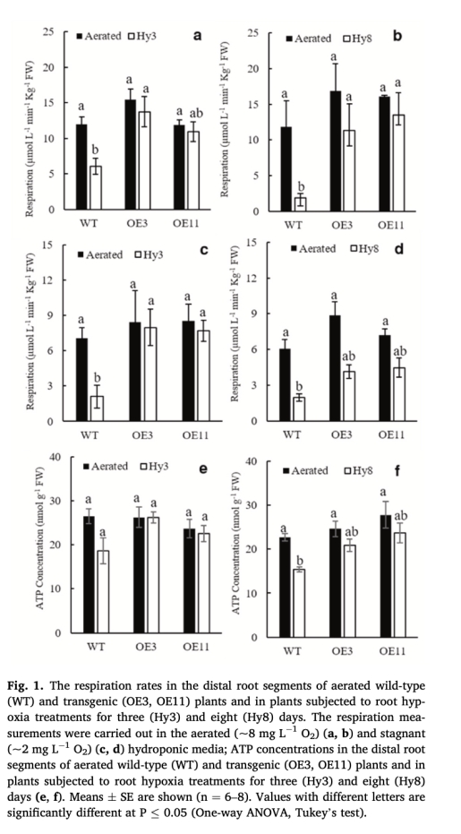 根呼吸速率與ATP濃度(圖1):證明轉基因植株在低氧下維持有氧代謝能力,避免能量危機。