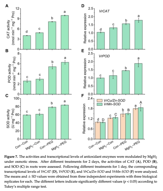 意義:證明滲透脅迫誘導內(nèi)源H2生成,而MgH2預處理進一步增加H2水平35.7%,表明其通過H2信號通路發(fā)揮作用