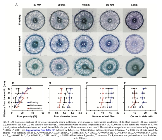 研究長(zhǎng)雄野生稻(Oryza longistaminata)的根和根莖在土壤水分梯度(淹水、正常澆水和缺水)下的解剖與生理響應(yīng),重點(diǎn)關(guān)注根莖的生理整合作用以及根和根莖的結(jié)構(gòu)適應(yīng)性。