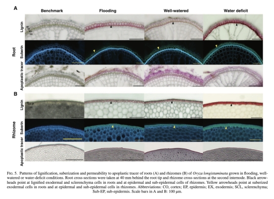 根莖的RWL和氧氣滲透性在所有水分條件下均較低(圖4G-H),顯示其固有屏障功能。