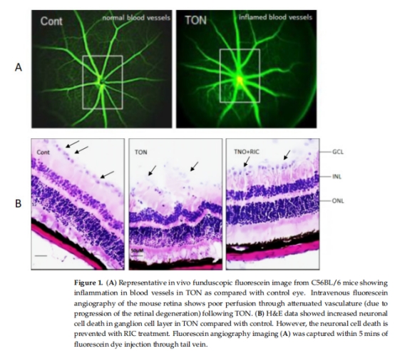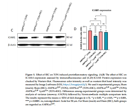 數據:免疫熒光/Western blot顯示ICAM-1(黏附分子)在TON中表達升高,RIC抑制其表達(野生型)。