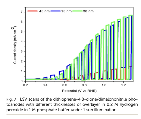 測量了不同二噻吩-4,8-二酮覆蓋層厚度(15, 30, 45 nm)下的LSV曲線(圖7)。