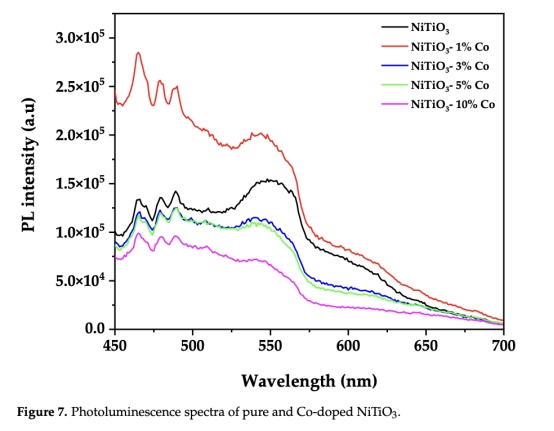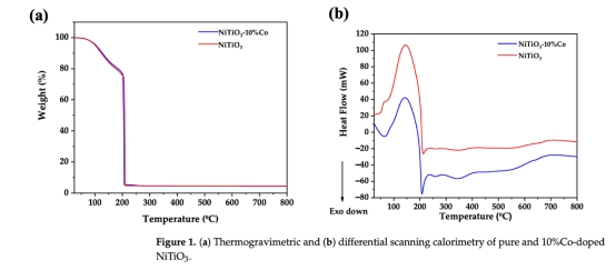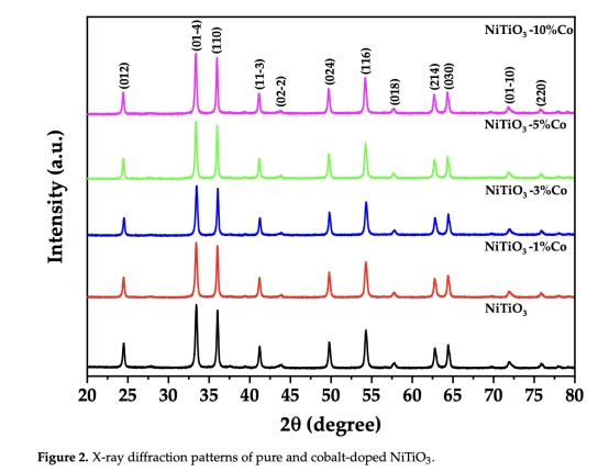 材料合成:采用溶膠-凝膠法制備純NiTiO3及不同鈷摻雜濃度(1%、3%、5%、10%)的樣品。