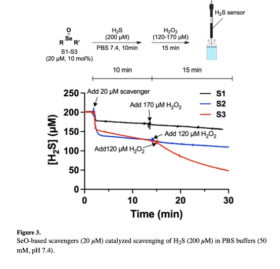 驗證催化循環(huán):通過H?O?添加后H?S的持續(xù)消耗(圖3中S3),證實硒化合物的催化再生能力。