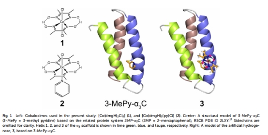 研究對(duì)象:基于全新設(shè)計(jì)的三α螺旋蛋白(a3C)和鈷基催化劑(鈷肟,cobaloxime)構(gòu)建的人工酶。