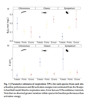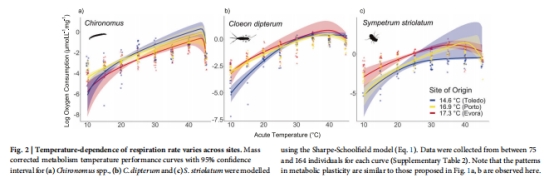 例如:搖蚊在évora(溫暖點)的呼吸速率顯著低于Toledo(涼爽點)(圖2a),解釋其速度下降的生理基礎。