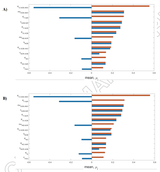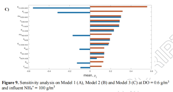 敏感性分析(圖9)表明:AOB相關參數(shù)(如KO.AOB.AMO、μAOB.AMO)主導排放,且不受傳質模型選擇影響。但傳質模型誤差可能導致生物參數(shù)校準失真(Section 4)。