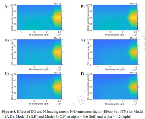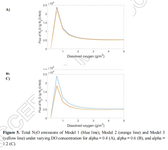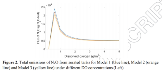 DO=0.6 g/m3時排放最大(EFN?O≈2.4–2.8%),模型差異顯著(圖2)。