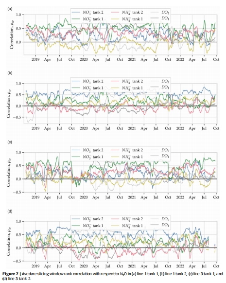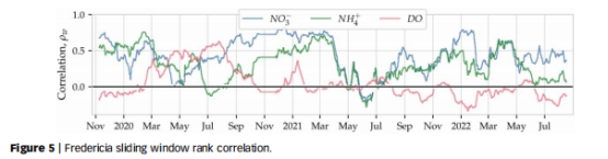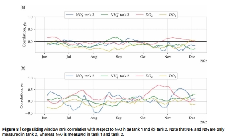 滑動窗口秩相關(窗口=30天),分析N?O與NH?/NO?/DO的時變關系(圖5–8)。