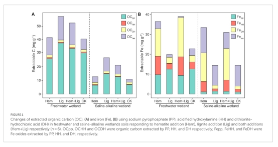 摘要指出:鐵氧化物(Fe)可通過吸附和共沉淀穩定有機碳(OC),但微生物鐵還原會破壞鐵結合有機碳(Fe-OC)并促進OC礦化。本研究通過向淡水和鹽堿濕地土壤中添加結晶鐵氧化物(赤鐵礦,Hem)和老舊碳(褐煤,Lig),探究兩者對OC平衡的影響。結果顯示: