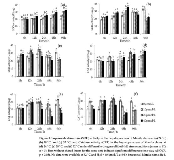 行為防御:低溫(24°C)或低H?S濃度(≤10 μmol/L)下,蛤類初期通過開殼增強攝氧(行為評分升高);隨脅迫時間延長轉為閉殼被動防御。高溫(≥28°C)與高H?S(≥20 μmol/L)協同脅迫時,蛤類立即閉殼。