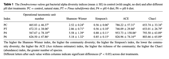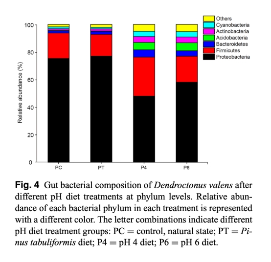 研究探究了不同pH飲食(自然狀態(tài)油松樹皮pH 4.7、弱酸性pH 6、強酸性pH 4)對紅脂大小蠹(Dendroctonus valens)腸道pH、菌群組成及聚集信息素馬鞭草酮(verbenone)產(chǎn)量的影響。結(jié)果表明: