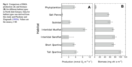 比較鹽沼洼地與其他河口生境(如潮間帶沙泥灘、 Spartina植被區(qū))的BMA生產(chǎn)力差異。