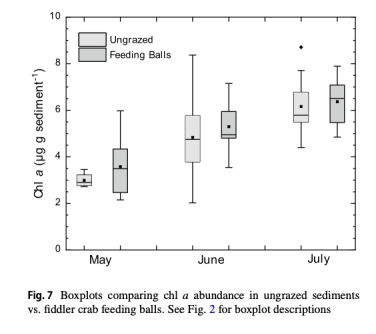 招潮蟹攝食:招潮蟹攝食球(feeding balls)與未攝食沉積物的葉綠素a濃度無顯著差異(圖7),表明其不直接消耗BMA。
