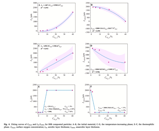 溶解氧分布:Unisense微電極(OX-25)測(cè)量顯示,堆肥顆粒內(nèi)部DO擴(kuò)散深度隨堆肥進(jìn)程和堆高增加而減小,厭氧層厚度(L_{ANA})增加(圖3)。建立C_{O2,S}(表面氧濃度)與L_A/L_{ANA}的擬合方程(圖4),預(yù)測(cè)閾值氧濃度(C_{O2,SA}/C_{O2,SANA})。