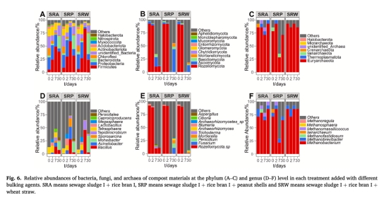 微生物機(jī)制:調(diào)理劑未顯著改變微生物群落結(jié)構(gòu)(圖6),但高溫期花生殼和小麥秸稈處理加速氮代謝和甲烷代謝基因表達(dá)。