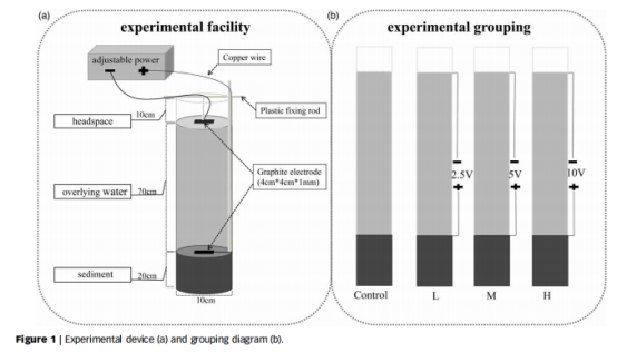 論文提出了一種電化學(xué)干預(yù)技術(shù)(施加2.5V、5V、10V電壓)用于修復(fù)黑臭水體。研究發(fā)現(xiàn):