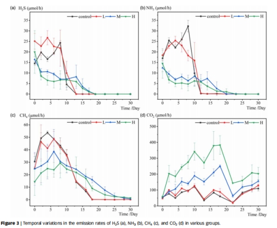 數(shù)據(jù):H?S、NH?、CH?排放↓(最高降幅70%),CO?排放↑(10V組達(dá)243.9 μmol·h?1)。
