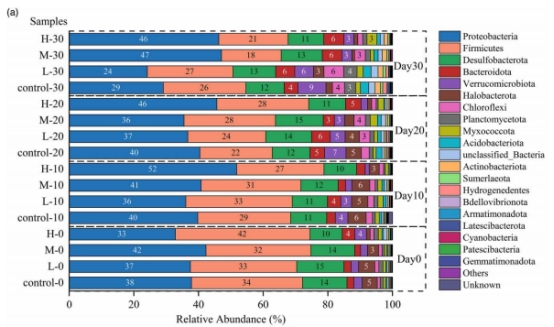 微生物群落重構(gòu):典型產(chǎn)甲烷菌(Methanosarcina、Methanolobus)和硫酸鹽還原菌(Desulfovirga)豐度下降,而化能異養(yǎng)菌(Dechloromonas、Azospira等)豐度上升。