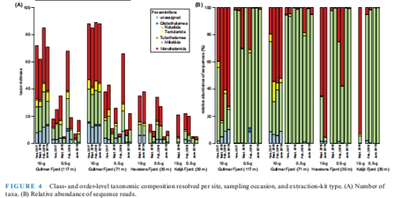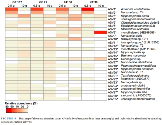 數據:0.5g樣本中 Ammonia confertitesta(ASV1*)占比83%,而10g樣本以單室有孔蟲(Monothalamids)為主(平均58%)。