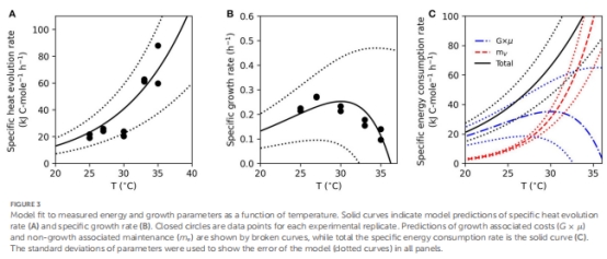 厭氧生長:>30°C時維持能(NGAM)顯著增加,生長效率驟降(f cat 從3升至15)(圖2, 圖3C)。