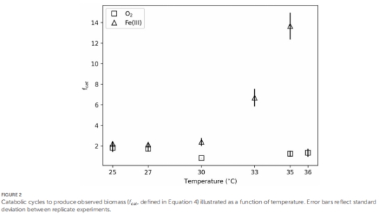 能量分配:Fe(III)還原在>30°C時,維持能(NGAM)顯著增加,導致生長效率下降(圖3C)。