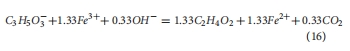 Fe(III):乳酸比 Ferrozine法 確定厭氧代謝化學計量比(1.46±0.15),修正傳統(tǒng)模型(式21)的預測偏差 結(jié)果3.3節(jié), 式16