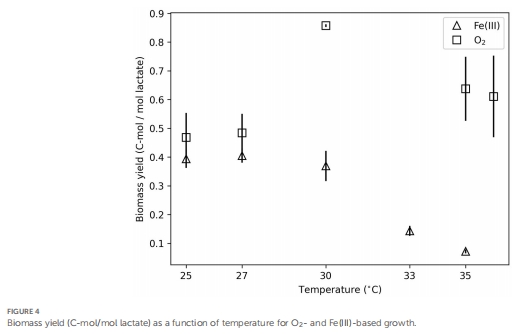 溫度影響:Fe(III)還原生長具有顯著溫度依賴性(25–36°C),30°C以下能量利用效率最高;O?還原生長則對溫度不敏感。