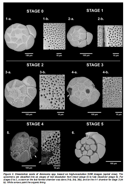 殼體溶解分級(SEM) 圖2-3, 6 建立6級溶解標準(DS-0至DS-5),揭示酸化導致殼體從剝落到完全溶解的連續過程。