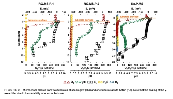 數據:O?濃度從表面300μM降至2mm深度以下不可測;pH從表面8.5-9降至內部5.5;氧化還原電位從+100mV降至-600mV