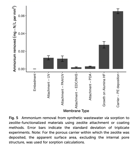 材料篩選:測試多種沸石負載方法(圖4),篩選銨吸附能力最強的載體(PE載體)和膜(氧化鋁中空纖維膜)(圖5);