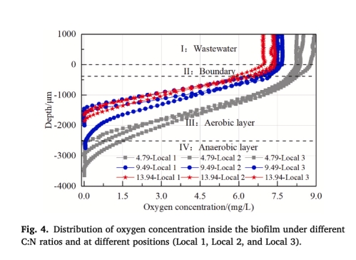 數(shù)據(jù):氧濃度分四區(qū)(廢水相→邊界層→好氧生物膜→厭氧生物膜),C:N=4.79時生物膜最厚(2422±411 μm)。