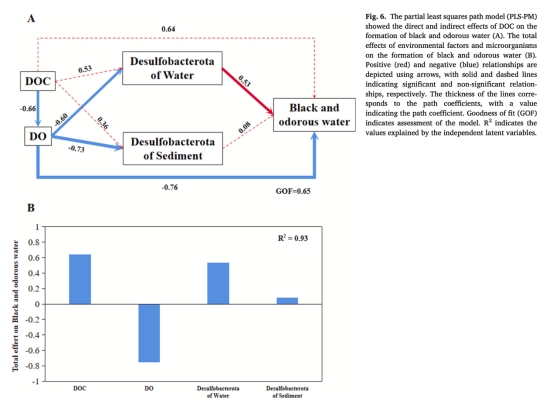 偏最小二乘路徑模型(PLS-PM)表明,有機碳通過降低溶解氧(DO)和改變微生物群落驅動黑臭形成,且水體中脫硫菌門的貢獻高于沉積物。