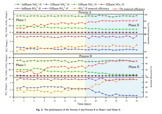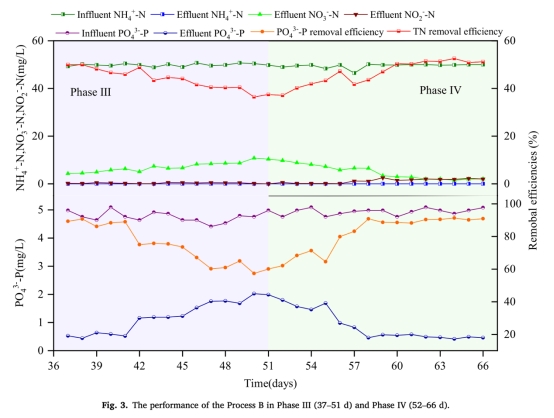 數(shù)據(jù):工藝B階段II出水NO??-N=4.28±0.38mg/L(對照13.79±0.81mg/L),PO?3?-P=0.54±0.15mg/L(對照2.59±0.22mg/L)