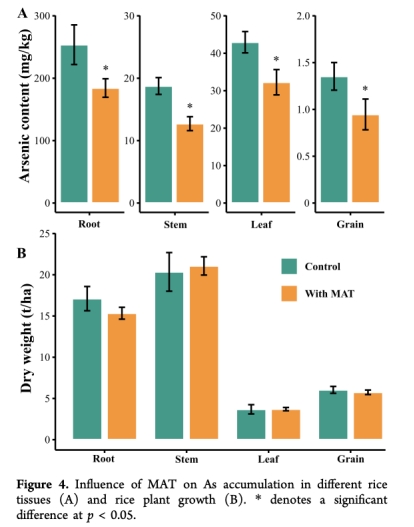 數(shù)據(jù):MAT使稻米籽粒砷含量降低30.0%,根、莖、葉砷分別降低27.4%、32.2%、24.9%。