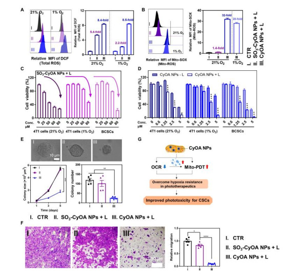 線粒體靶向PDT:CyOA NPs富集于線粒體,激光照射后產(chǎn)生高濃度Mito-ROS(圖4B)。