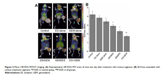 數據:ES+GEM組SUVmax值最低(1.73),顯著低于對照組(4.2)和單藥組(ES組3.83,GEM組3.4)。