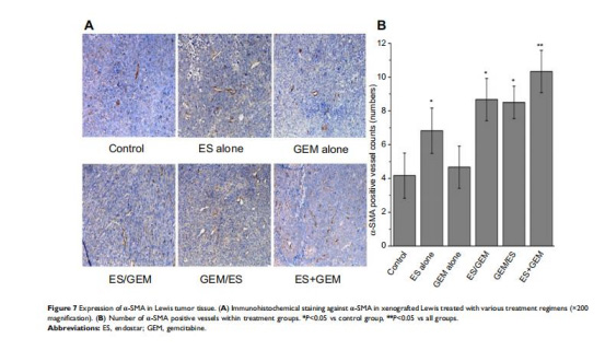 α-SMA上調(圖7):ES+GEM組α-SMA陽性血管最多(10.33條/mm2,對照組4.17條/mm2)。