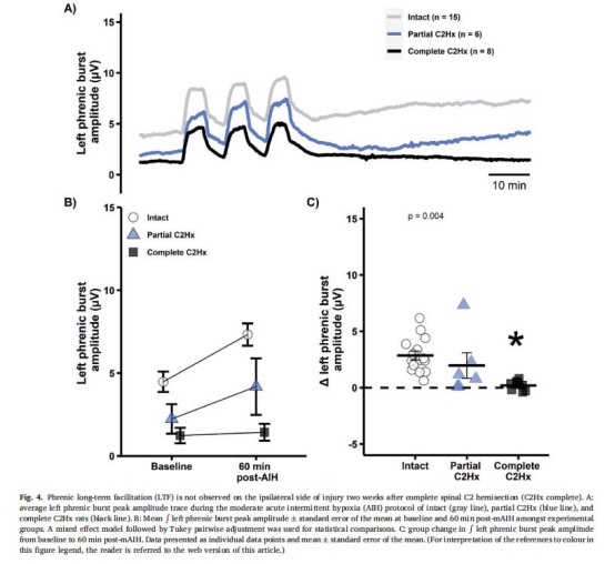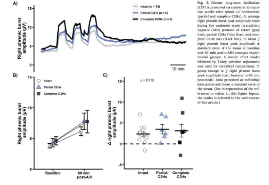 膈神經可塑性受損:完全性C2Hx損傷同側pLTF消失,但對側pLTF保留。
