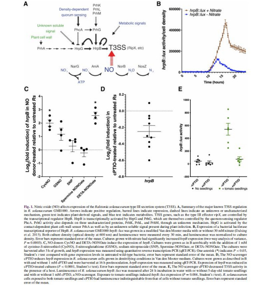 NO是T3SS的關(guān)鍵激活信號:青枯菌通過反硝化產(chǎn)生的NO直接上調(diào)hrpB表達,進而激活T3SS基因簇,優(yōu)化毒力效應因子的分泌。