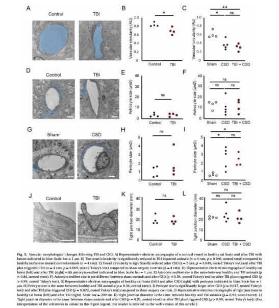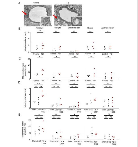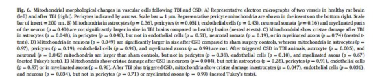 TBI后線粒體嵴損傷見于星形膠質(zhì)細(xì)胞和周細(xì)胞(圖6C);CSD誘導(dǎo)線粒體腫脹(神經(jīng)元和星形膠質(zhì)細(xì)胞,圖6D-E)。