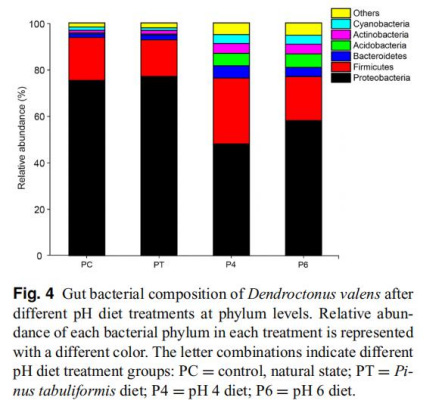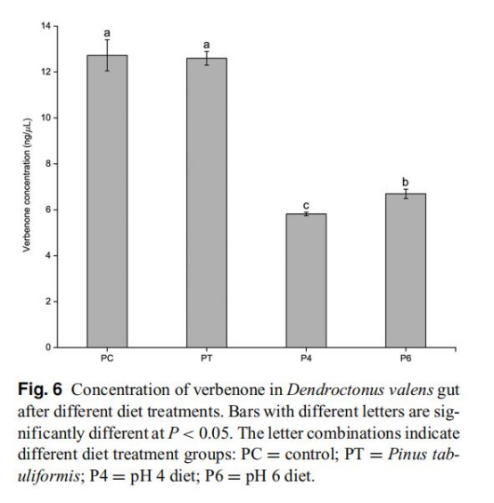 本研究探究了腸道pH環境對紅脂大小蠹(Dendroctonus valens)腸道菌群組成及其關鍵聚集/反聚集信息素verbenone產量的影響: