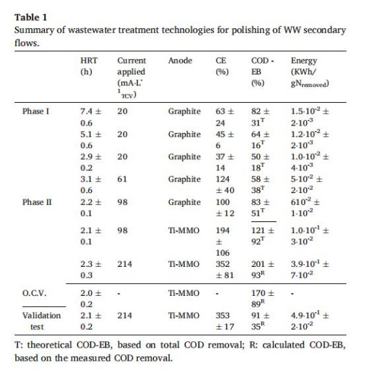 研究意義:比較陽極材料效果,Ti-MMO陽極將總大腸菌群降至0.4 log(CFU·100 mL?1),證明其高效消毒能力(優于石墨陽極),意義在于減少化學消毒劑使用,滿足廢水回用標準(如意大利法規要求E. coli ≤1 log CFU·100 mL?1)。