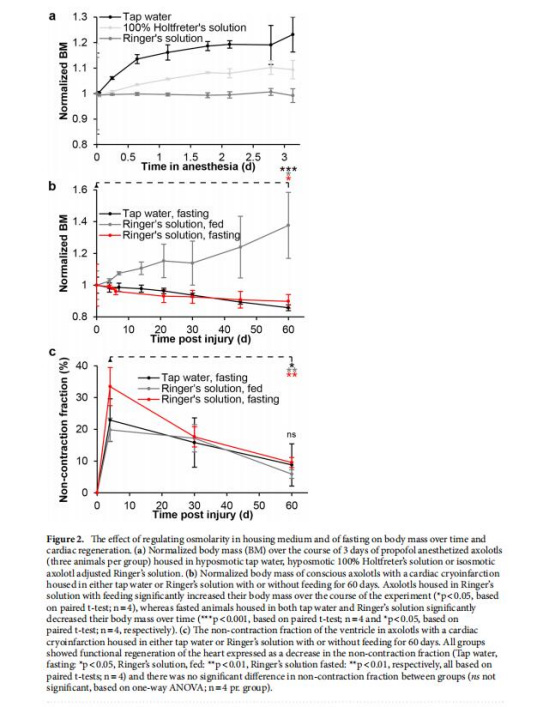 非收縮分數顯著↓(圖2c: 禁食組p<0.05,喂食組p<0.01;圖4c: 麻醉/清醒組p<0.05),證實心臟再生不受環境滲透壓或麻醉影響。