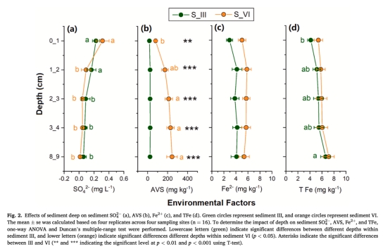 pH垂直剖面(圖1c)顯示污染環境堿性增強(pH 8.06 vs 清潔組7.24),影響硫化物化學形態及微生物代謝途徑;